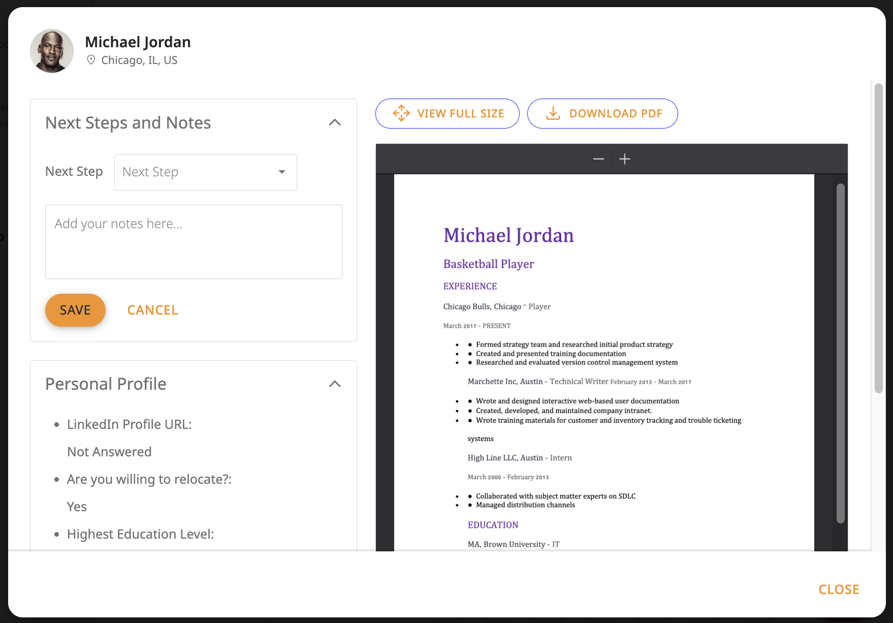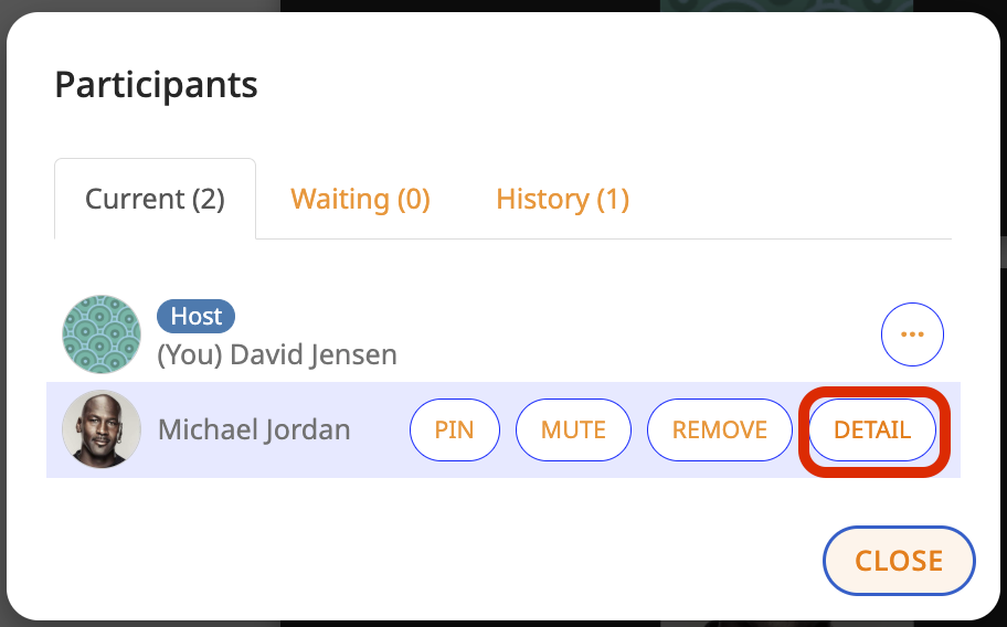 A Host may also hover over participants currently in the room where they will have the option to Pin, Mute and Remove them from the room. If the host clicks on Detail they will be able to access the participants resume and/or registration questions during the session. While reviewing the participants info, the host can also rate and leave notes for easy reporting and post event follow up.