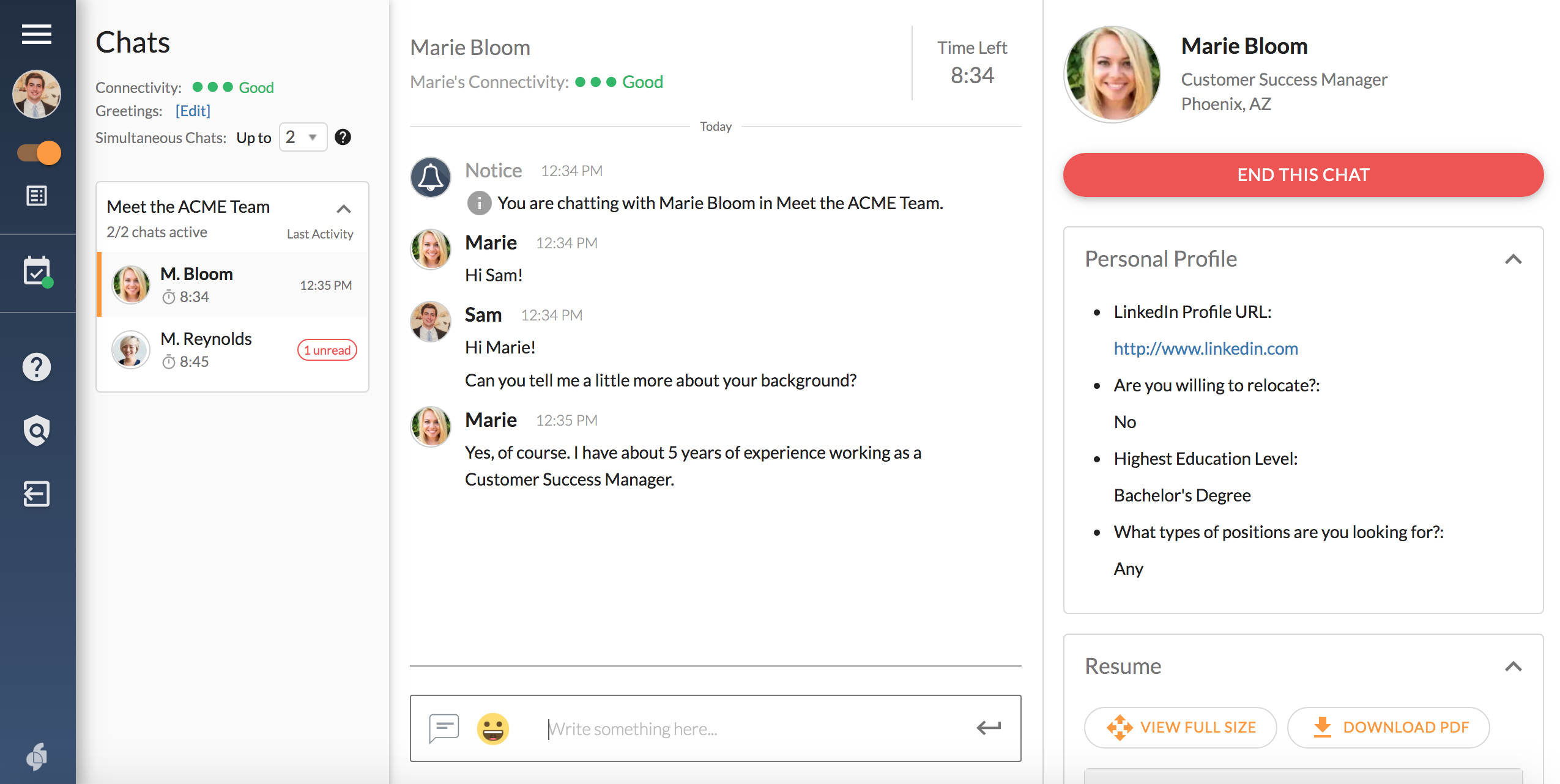 Click the prompt, type your message, send. Reps receive it with your profile.