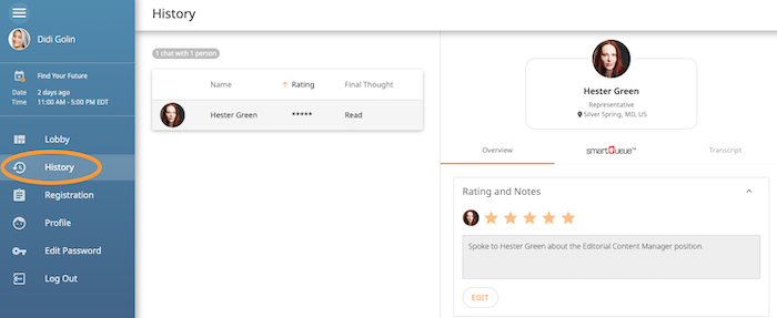 Once connected, interact. Representatives may invite you to 1‑on‑1 chat. After chat, complete notes/rating, click Finish.