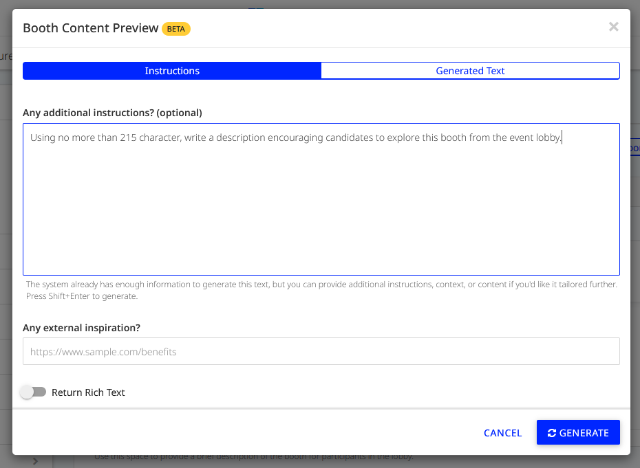 Clicking on the Sparkle Button will open the AI Inspiration Generator. Here the user will be presented with a prompt where they can write a brief description of the type of content they would like to generate. The more specific the user is with key words and phrases, the more accurate the content will be.
