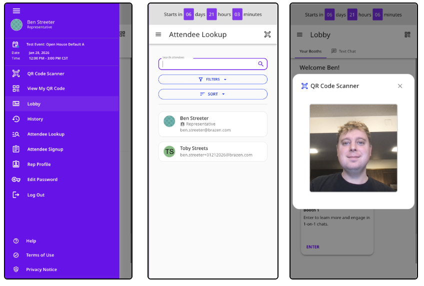 Event Reps will see the option to scan a QR code within the event's side menu as well as within Attendee Lookup. Event Reps also receive their own personalized QR code which can be presented in cases where Reps are checked in at the event space. Scanning an attendee's QR code will load the attendee profile within Attendee Lookup similar to a manual search. Reps will then need to decide what next action to take (e.g. Check in the attendee, Connect with the attendee)