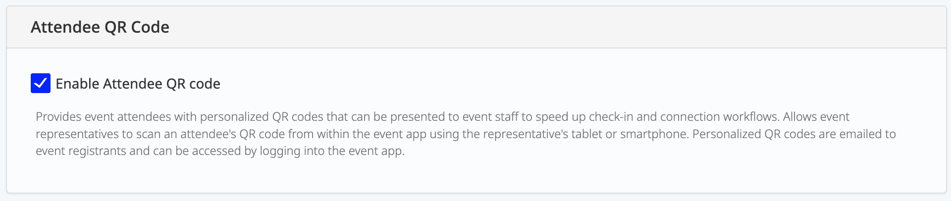 The Enable Attendee QR code setting can be managed within an Event > Settings > Advanced Settings page.