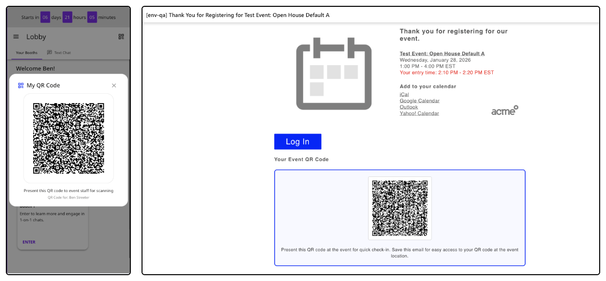 The In-Person Event experience has been enhanced with a personalized QR codes for event attendees. When the Attendee QR code feature is enabled for an event, all registrants will receive a personalized QR code in their registration confirmation email as well as be able to access the QR code from within the Event application before and during the event.